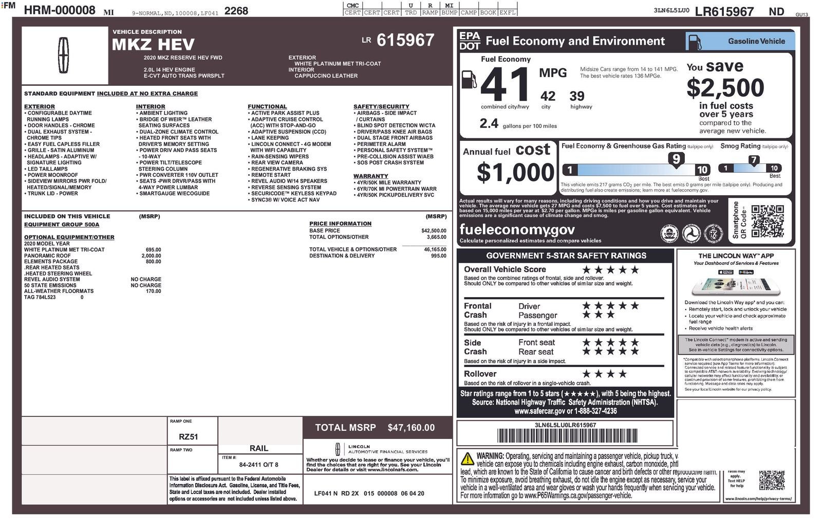 MKZ Hybrid Reserve, 4D Sedan, 2.0L I4 Atkinson-Cycle iVCT, eCVT, FWD, White Platinum Clearcoat Metallic, Cappuccino Leather, AppLink/Apple CarPlay and Android Auto, Auto-dimming door mirrors, Exterior Parking Camera Rear, Fully automatic headlights, Heated Rear Seats, Memory seat, Navigation System, Panoramic Retractable Roof.